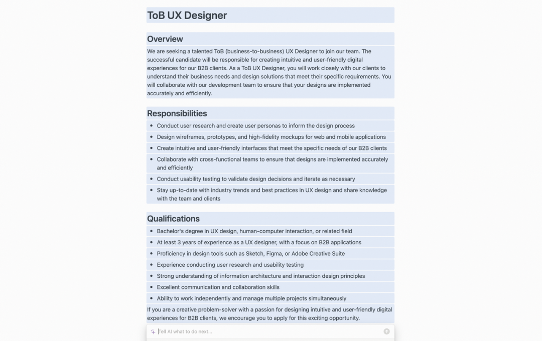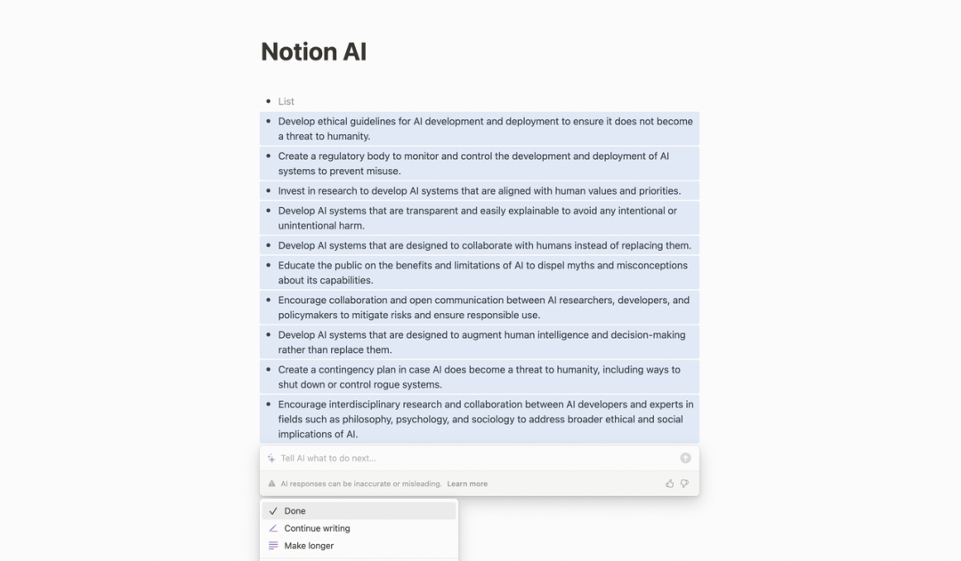 在Notion中通过空格键触发下拉框中的AI功能选项,功能大致可以被划分为三块:内容创作,基于已有内容的优化,个性化的内容生成。当你拿到这个题目但完全不知道如何下笔之时,你可以选择Notion AI的“头脑风暴”的选项,它能够迅速帮你列出一些与这个主题相关的要点供你寻找灵感。