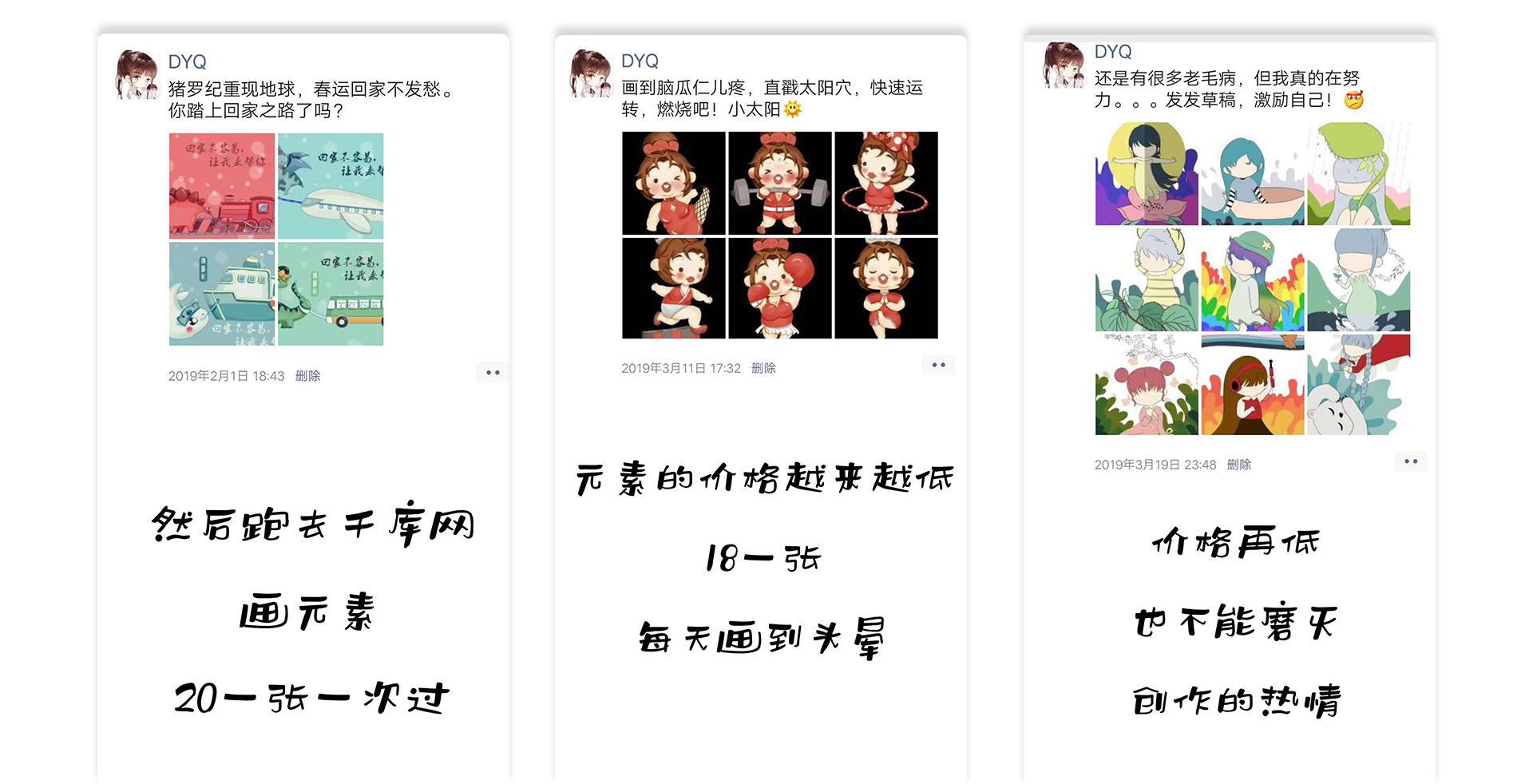 经过一番折腾,我终于在千图用自己账号画元素,刚开始插画元素有三四十元一幅,慢慢越来越廉价,变到十元左右,到现在还是有人做的,不过变成抢词按热点画。小白的我画了半年元素,有点腻了。然后跑去摄图网画插画了。在摄图追了大半年热点插画的我,每天忙得不可开交,一个月只赚两千不到,我又开始寻找提升自己的方法。