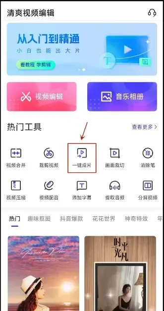 只需在首页热门工具中点击“一键成片”功能,上传需要的素材,视频和照片均可;