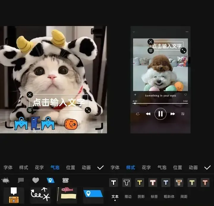 可以自由设置字体、样式、花字、气泡、位置和动画等,放置视频页面后拖动、缩放调整位置和大小即可,文字样式非常丰富~