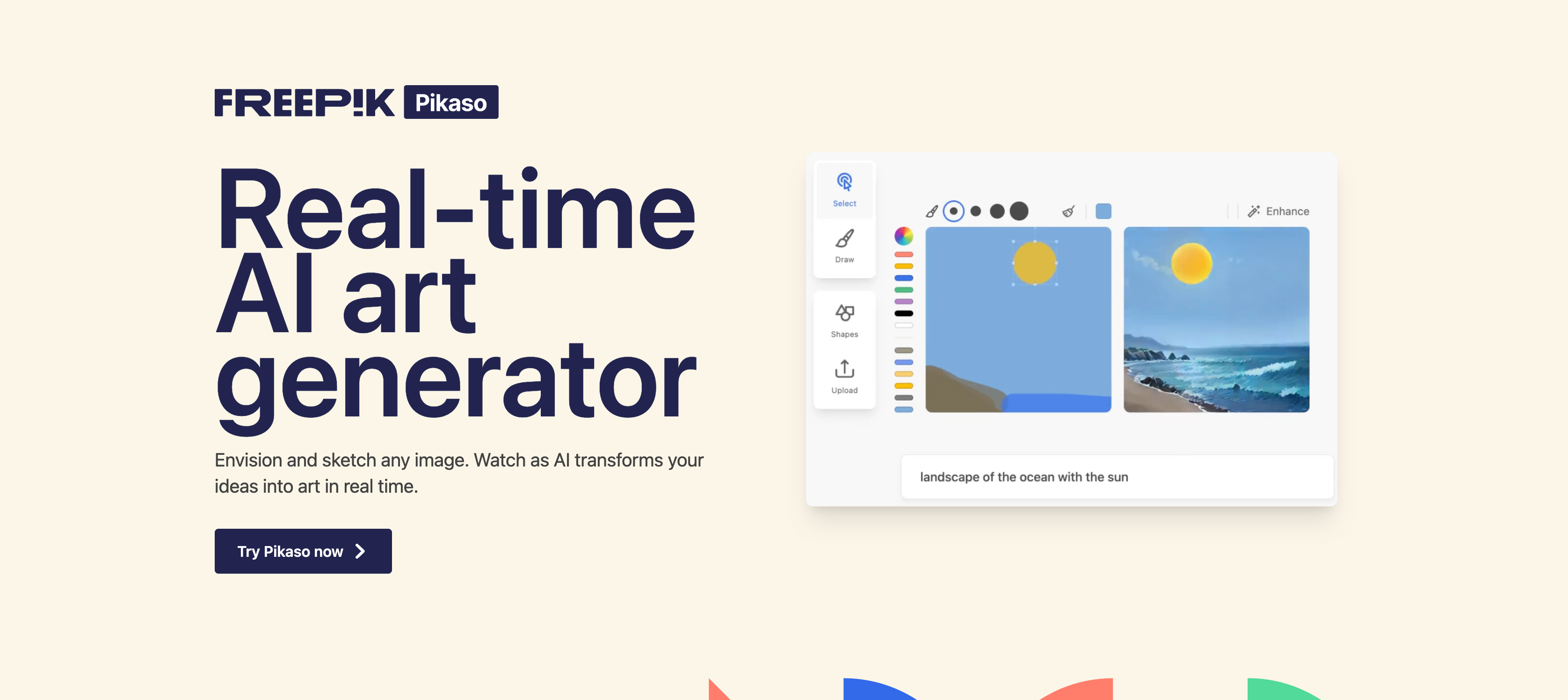 Pikaso是一款由Freepik开发的在线实时涂鸦出图工具,用户只需快速绘制简单的草图,就可以创作出任何他们能想象到的图像。用户可以通过将简单手绘与文字结合,在几秒钟内轻松生成AI艺术效果。工具还提供图标、形状和元素库,让用户可以立即将自己的创意想法变成现实。Pikaso为用户提供了一个平台,使他们能够通过简单的绘图就实时创建和编辑图像。