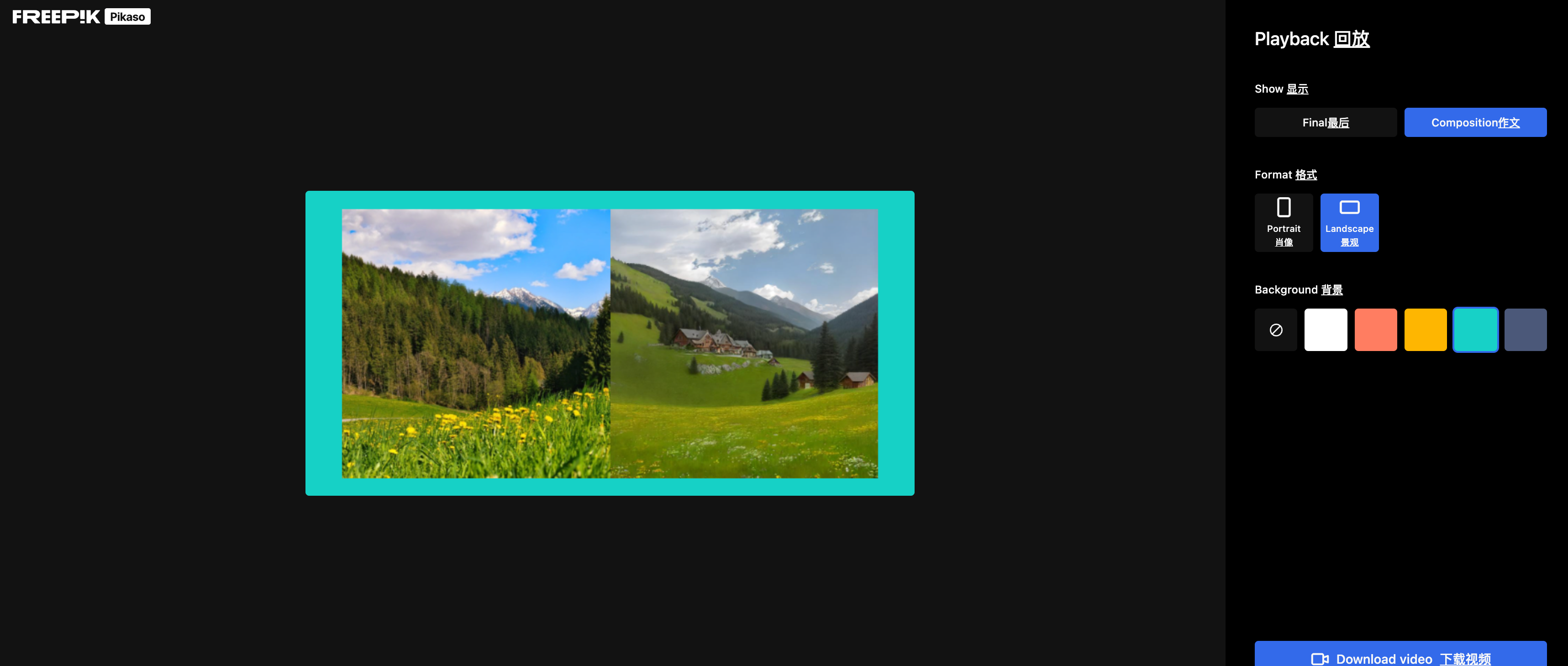 Pikaso支持将操作步骤生成视频回放,可以更直观的展示图片的生成过程,并且可以指定生成视频的格式和方向,还可以添加边框等。如果需要视频,直接点击下载即可。