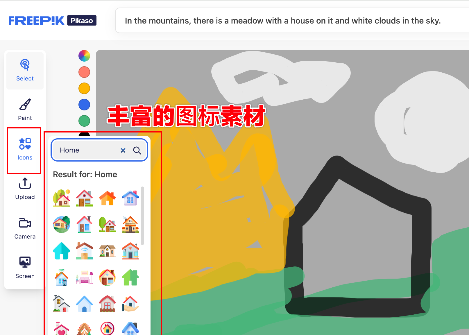 Pikaso提供了非常多的图标素材,可以直接搜索选择图标,添加到你的涂鸦中。效果一下子好非常多,小破房子直接升级小别墅。