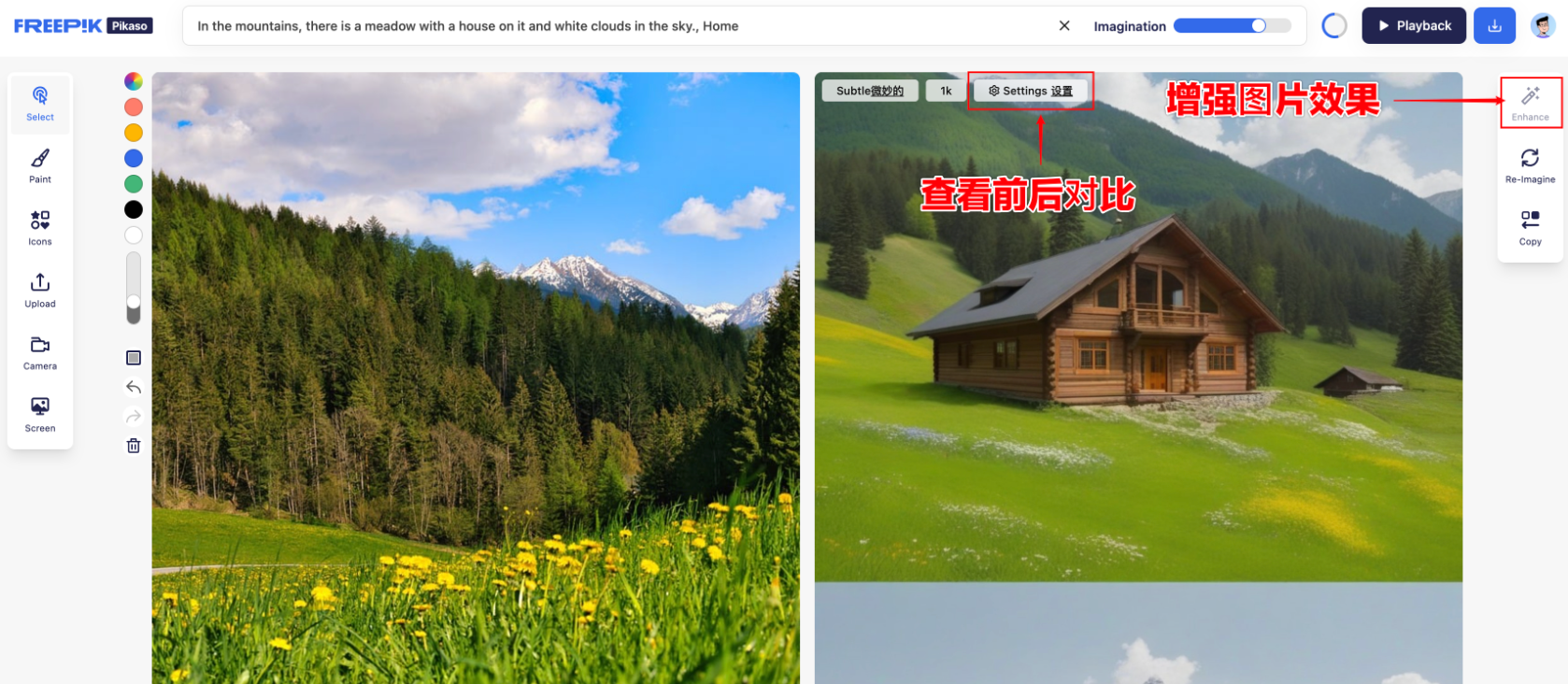Pikaso直接对图片进行效果增强,整体细节会更加充实,建议在生成效果差不多的情况下再进行增强,效果更好了。你也可以点击「设置」按钮,查看增强前后的效果对比。