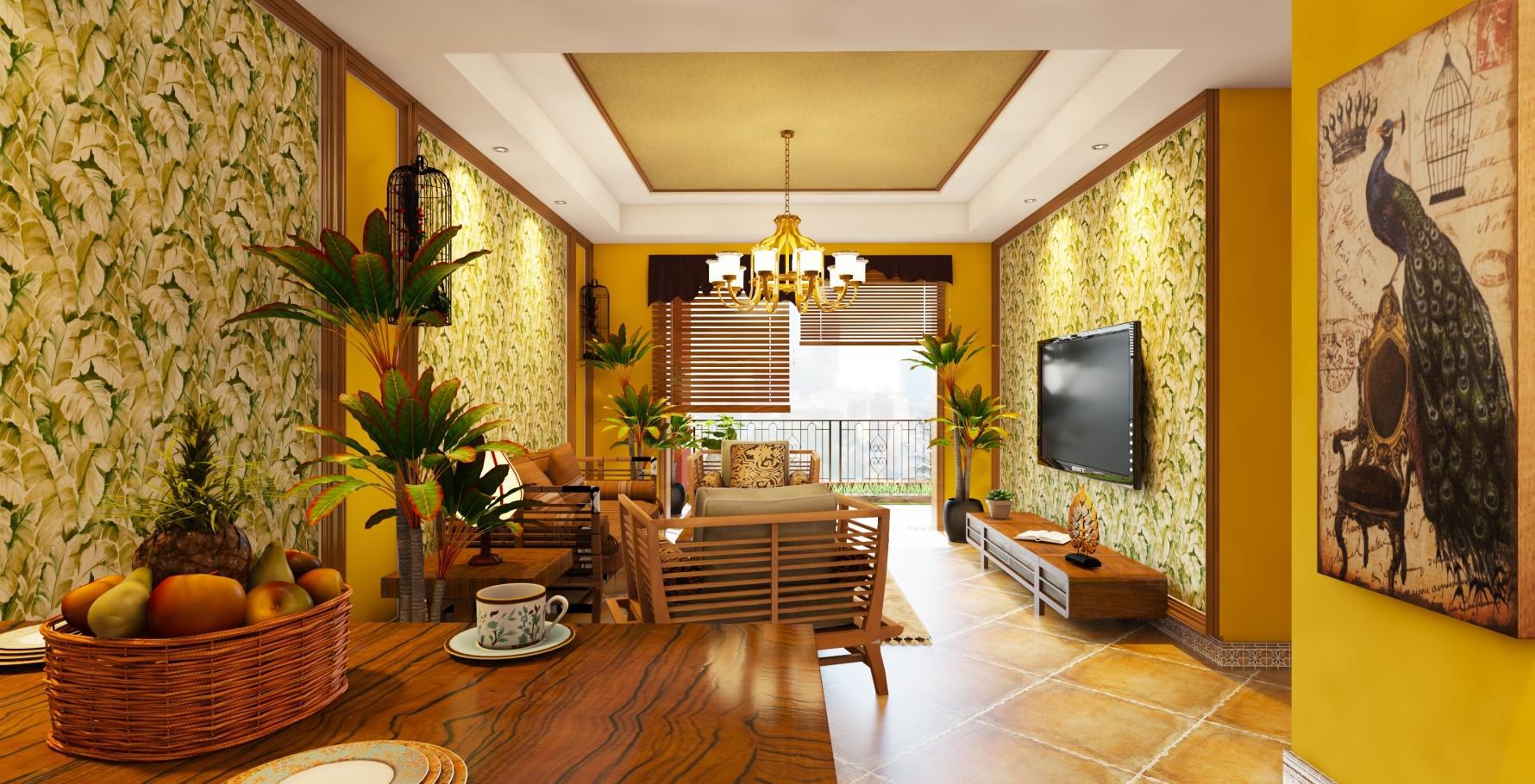 东南亚装修风格最大的特点就是用色大胆,采用纯天然的藤条、竹子、石材等材料来装饰,突出一种纯朴、自然之美。这种风格的特点是原始自然、崇尚手工。从造型上来说,以对称的木结构为主;电视墙采用芭蕉叶砂岩造型,营造出浓郁的热带风情。