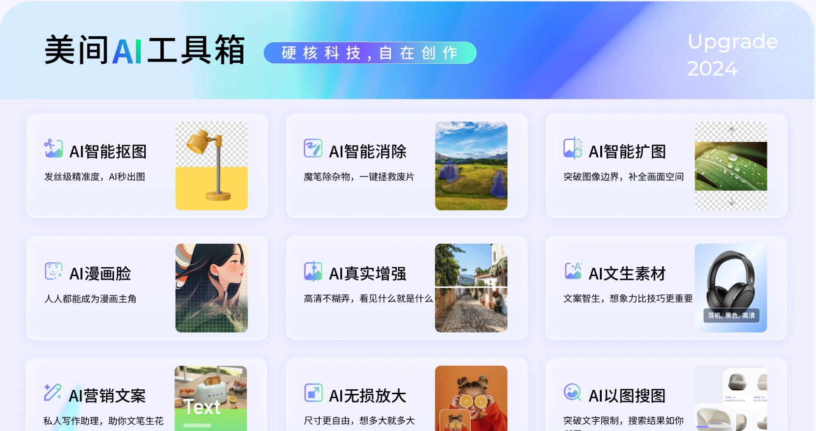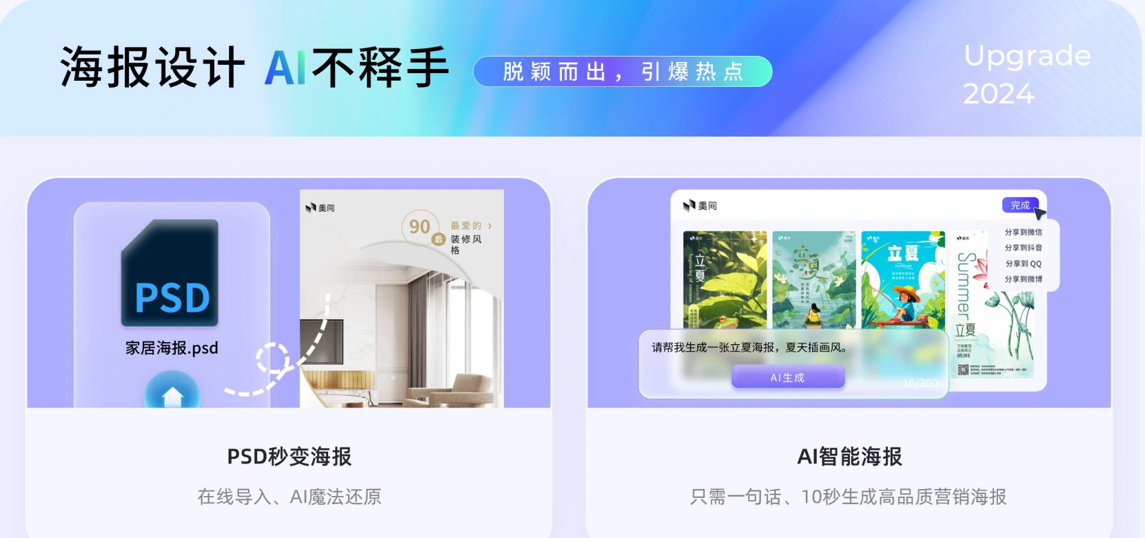 美间全面升级,新的美间超智能,从设计到营销,AIGC全面加持,用超能力解放生产力;新的美间超全能,个人/企业版本全升级,更多功能,更广覆盖,多样需求都能胜任;新的美间超懂你,精准聚焦个性化需求,天生善解人意,你的烦恼TA都懂!