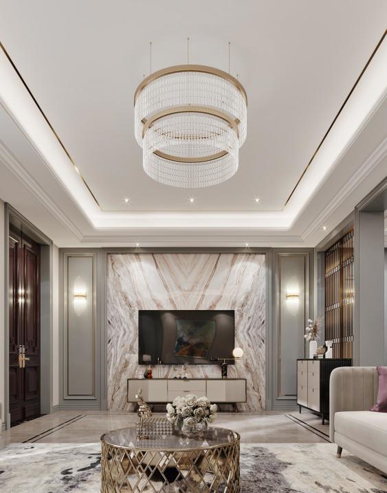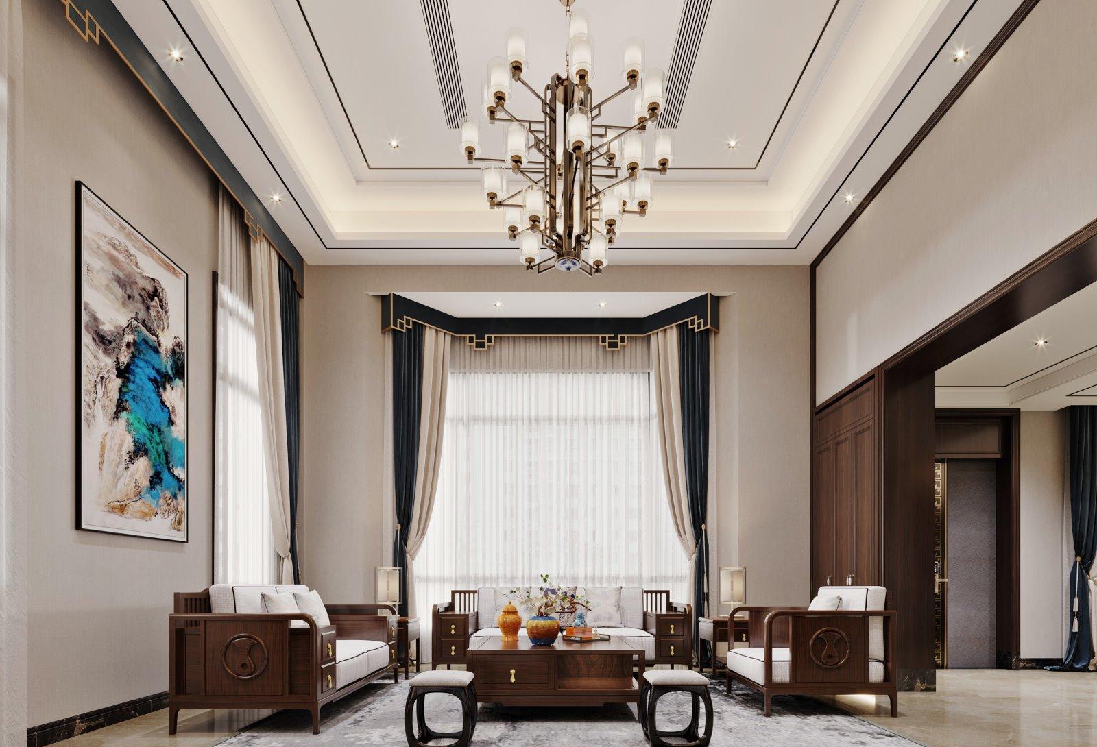 客厅大气简约,融入传统文化元素,彰显中式雅致风格。木线条吊顶展现东方美感,营造空间与人的微妙互动。
