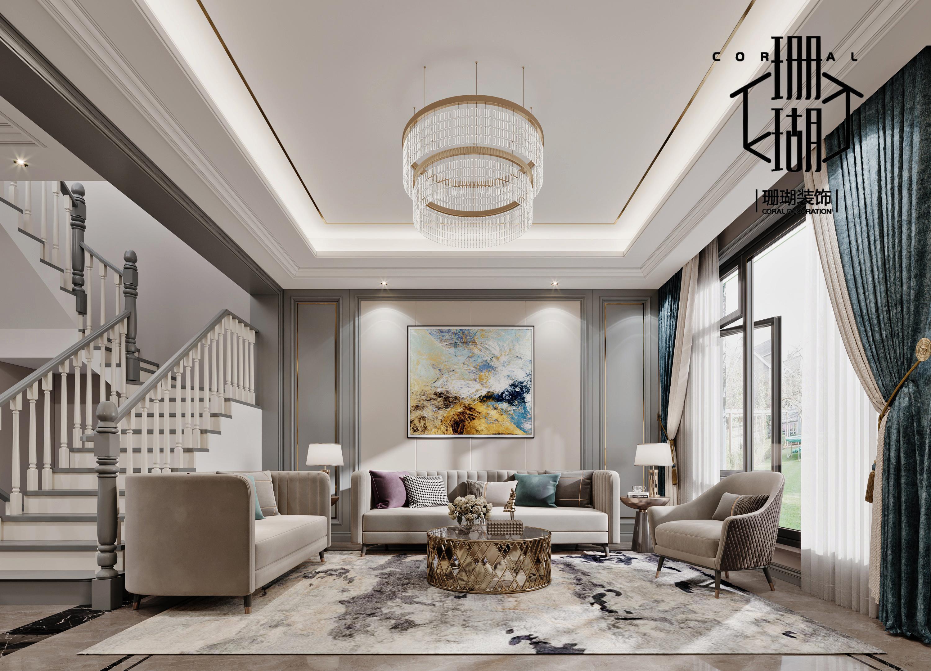 客厅大面积的落地玻璃窗,将室外美景尽收眼底。中性色调营造高雅大方气韵,灰背景墙和装饰画相得益彰,使空间更加通透。