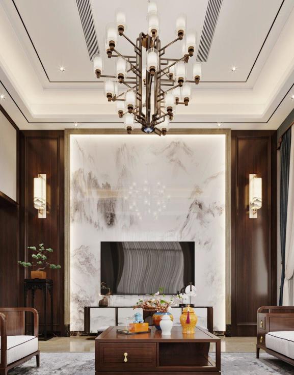 客厅大气简约,融入传统文化元素,彰显中式雅致风格。木线条吊顶展现东方美感,营造空间与人的微妙互动。