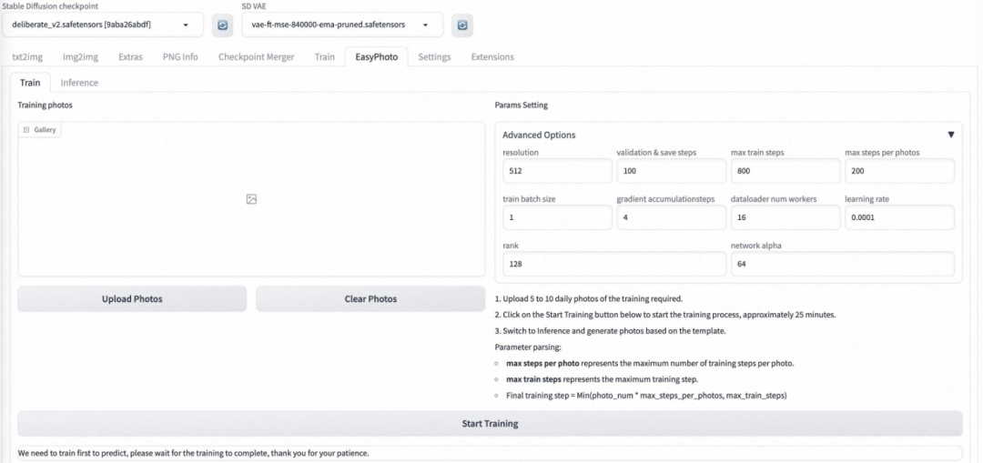 2、点击顶部的“EasyPhoto”进入插件,上传5~20张照片,然后点击“start training”开始训练,首次训练会下载模型,并且插件会提示输入ID。