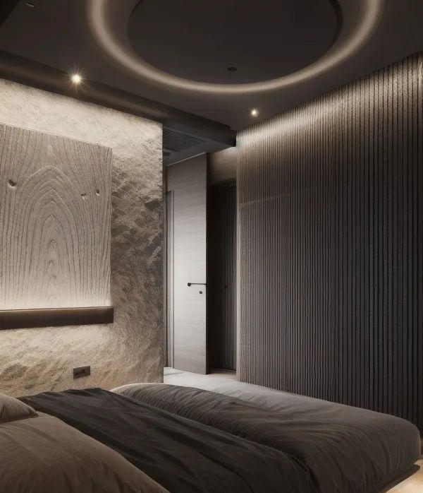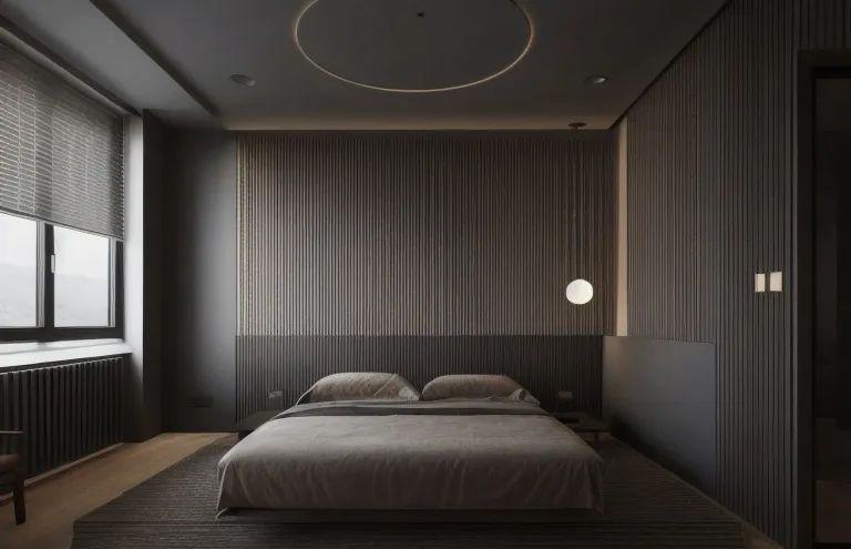 卧室延续整体色系,创造慵懒、神秘的空间感。木质格栅增加通透感,隐秘中不失个性品位。