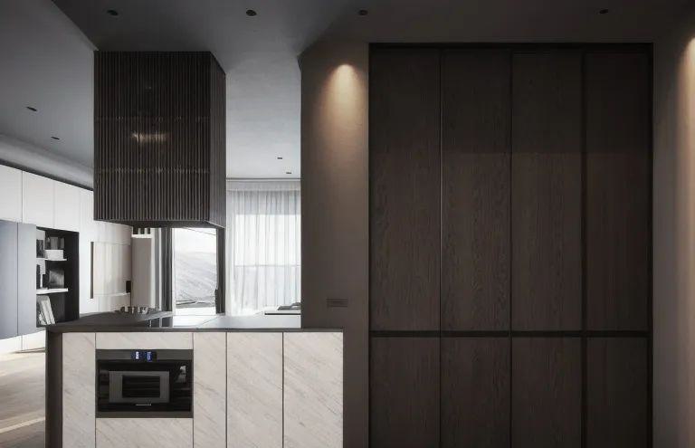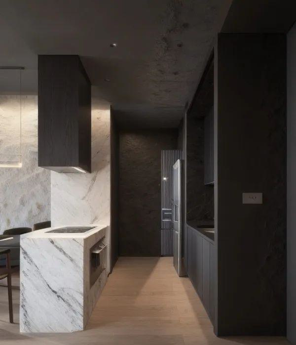 厨房利用硬朗的线条增加立体感,宽大的橱柜便于收纳生活用品,营造简洁空间。不同材质的肌理搭配,视觉内敛中不乏张力。