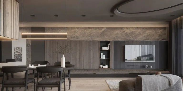 客厅与餐厅的连通视野,地板和家具采用深色木质元素,有效减轻空间中黑色带来的沉闷感。