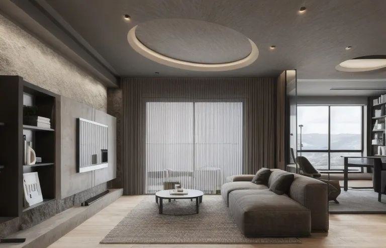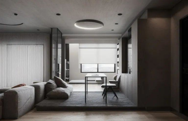 客厅的整体灯光设计不仅有主照明,还配置了氛围灯带系统,为空间增添神秘氛围。灰色沙发、棉麻触感的地毯,以内敛的色调展现空间个性和质感。