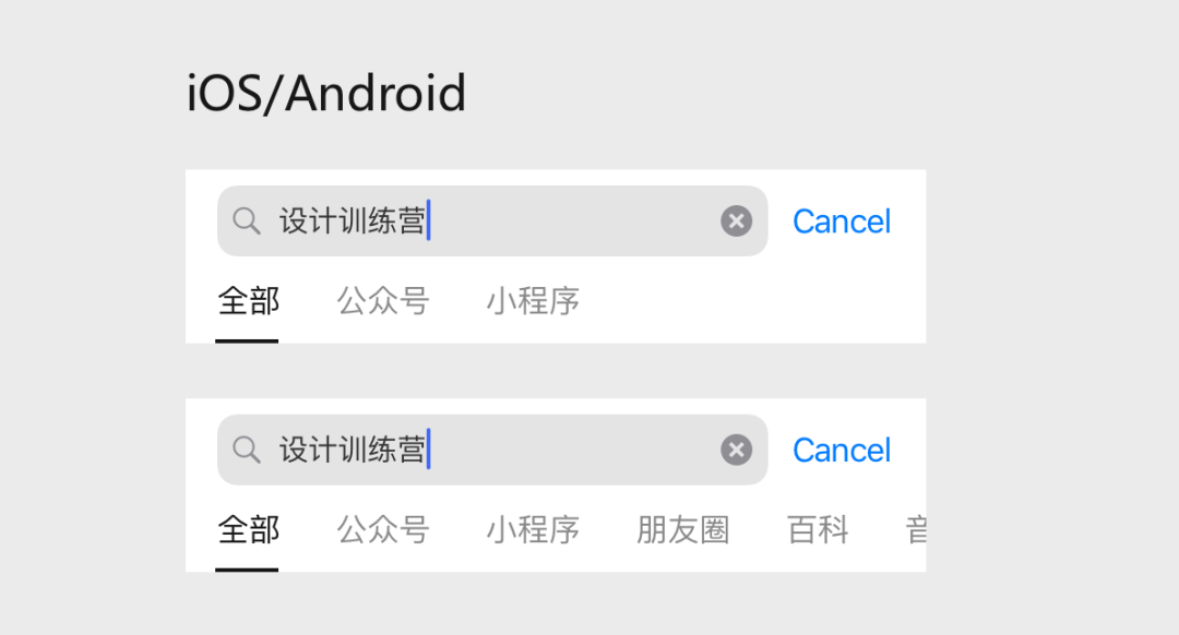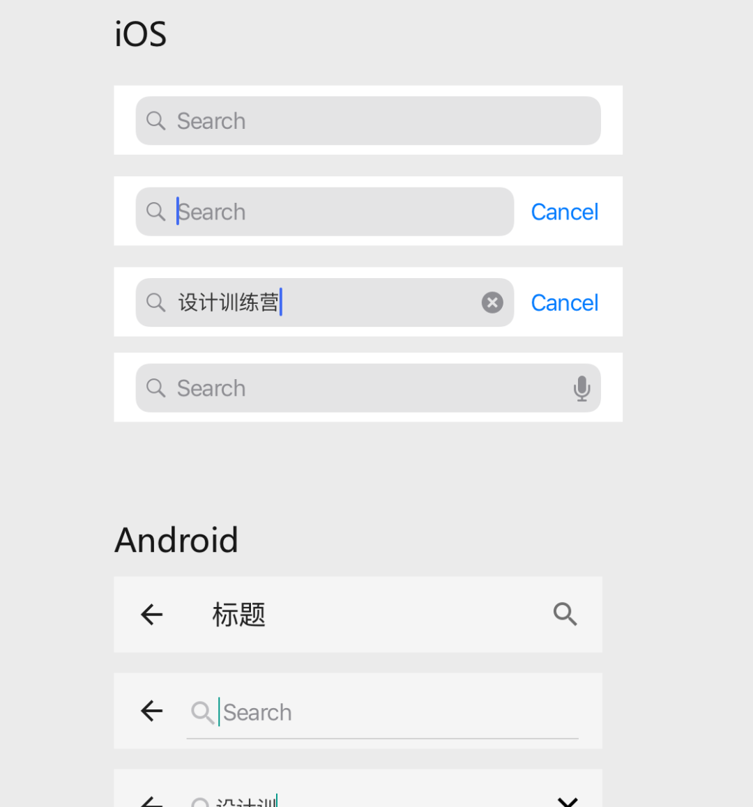使用说明:iOS隐藏搜索栏,下拉显示;Android通过搜索图标展开搜索栏。