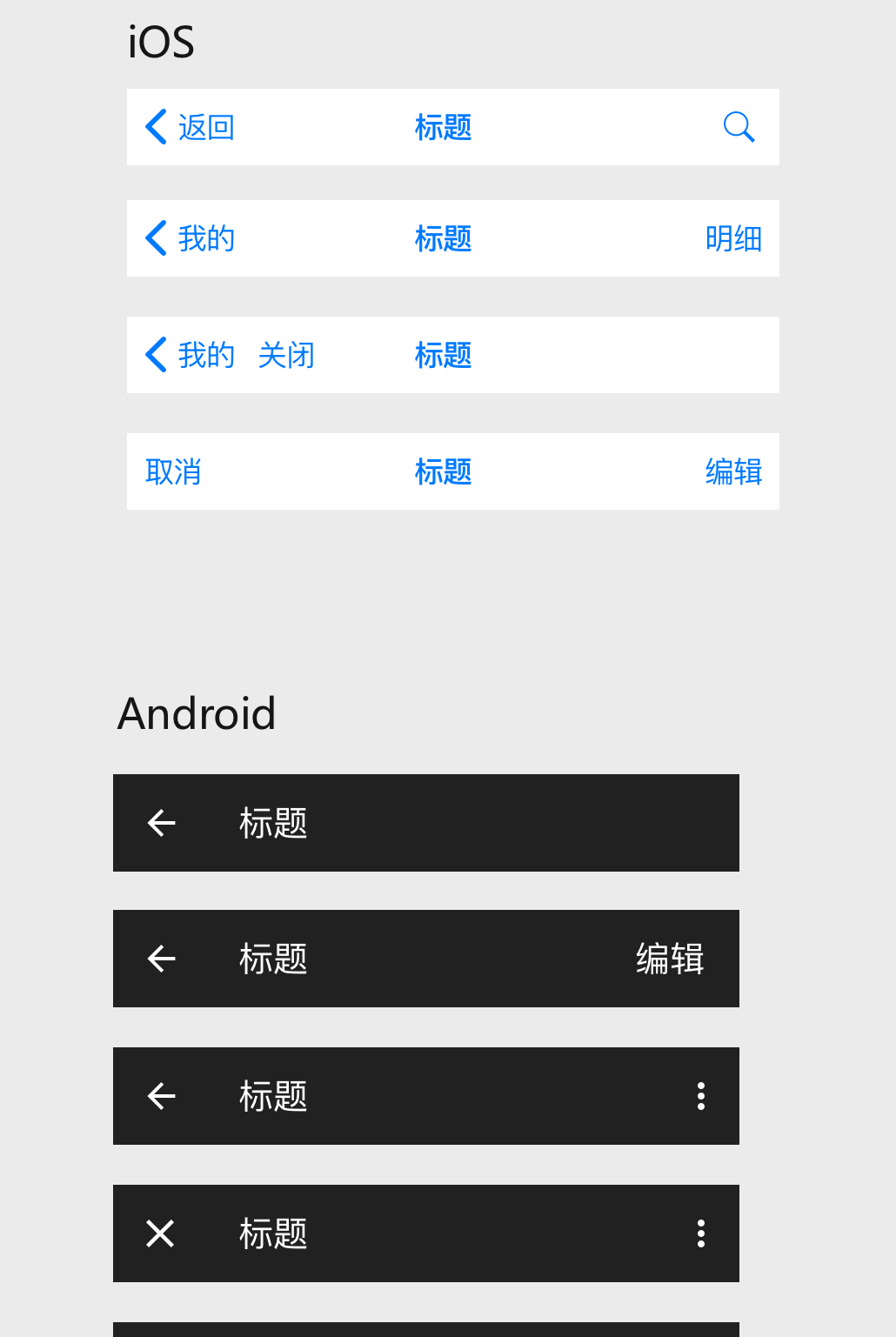 用途:告知当前界面信息,提供返回或关闭操作,快捷功能入口。