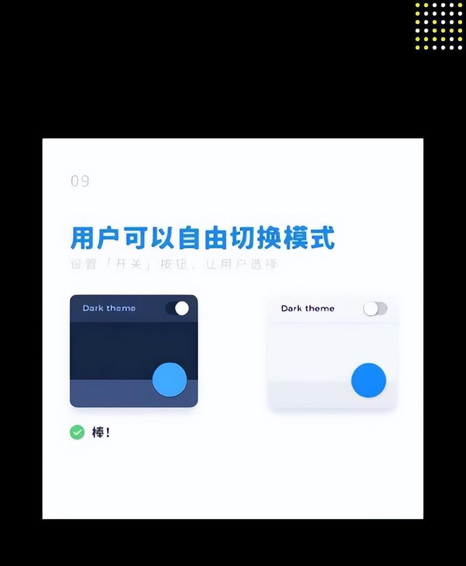 • 用户自由切换模式,设置开关按钮,让用户选择。