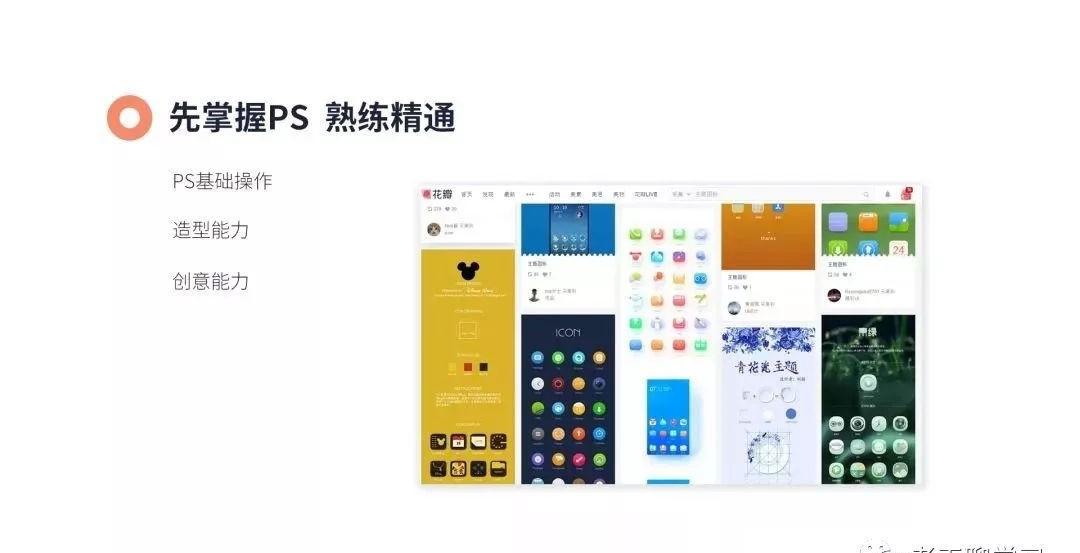 初学者可以通过模仿学习提升操作技巧,推荐一个不可或缺的设计素材网站(花瓣网)。从最基础的UI图标开始学习,找到优秀的图标进行模仿学习,提升造型能力和创意能力。