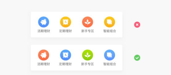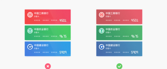 在App设计中,常常会运用卡片设计,而卡片的颜色直接影响用户的视觉体验。因此,务必确保选用的颜色让用户感到舒适。比如,左侧案例中卡片的饱和度和明度过高,这一点可以参考目前热门的App设计,如微信、支付宝等,它们在银行卡片设计中的用色几乎是完美一致的。