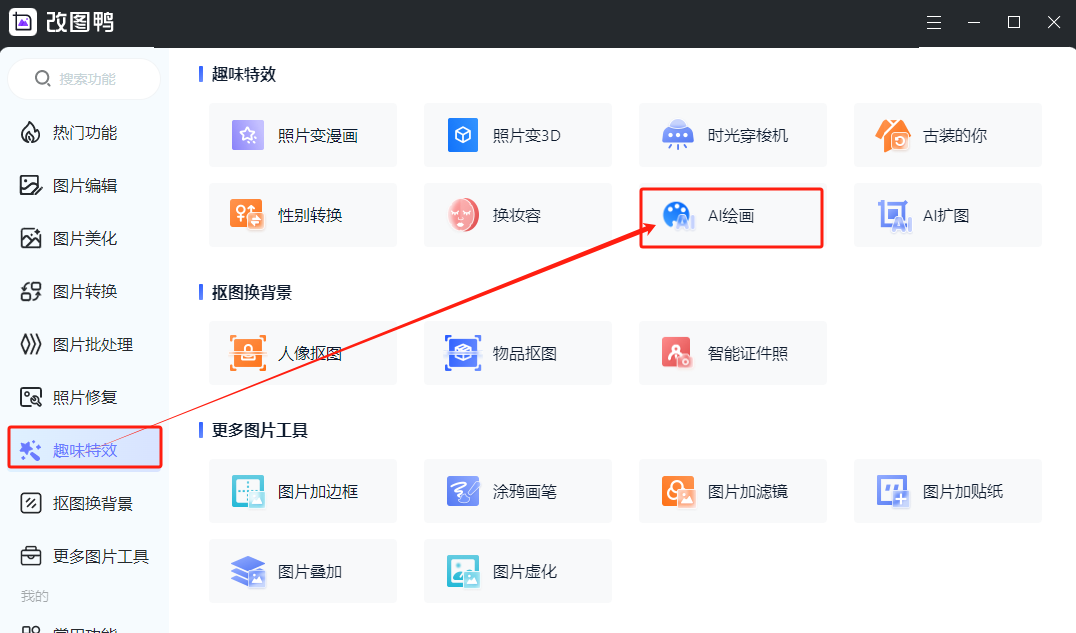打开改图鸭,首页推荐工具内“AI绘画”功能按键跃入视线,单击即可切换至AI绘画界面。