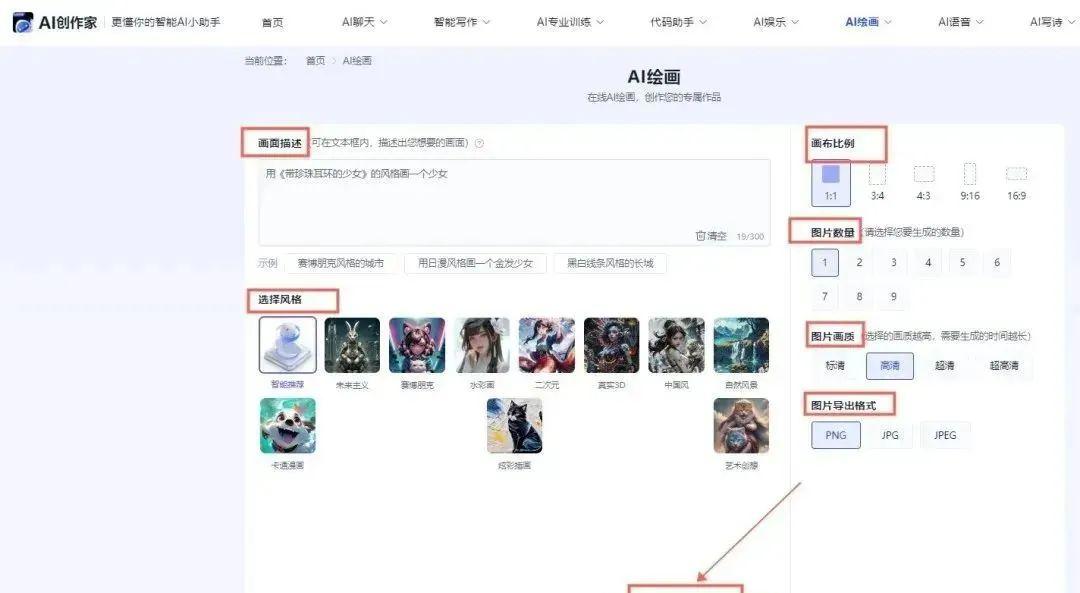 接着根据我们的需求输入详细的画面描述、勾选所需的生成风格和画面比例等参数,点击“立即生成”,系统便会进行绘制。生成完毕后,一幅令人惊艳的画作将展现在我们面前,点击"立即下载"即可轻松保存。