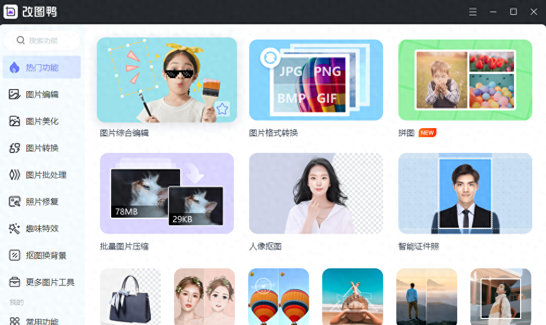 这款改图鸭界面UI设计非常简约!除常规图片编辑功能外,更具备AI绘画、照片修复以及艺术签名等独特专长!使用便捷,点击即可使用。