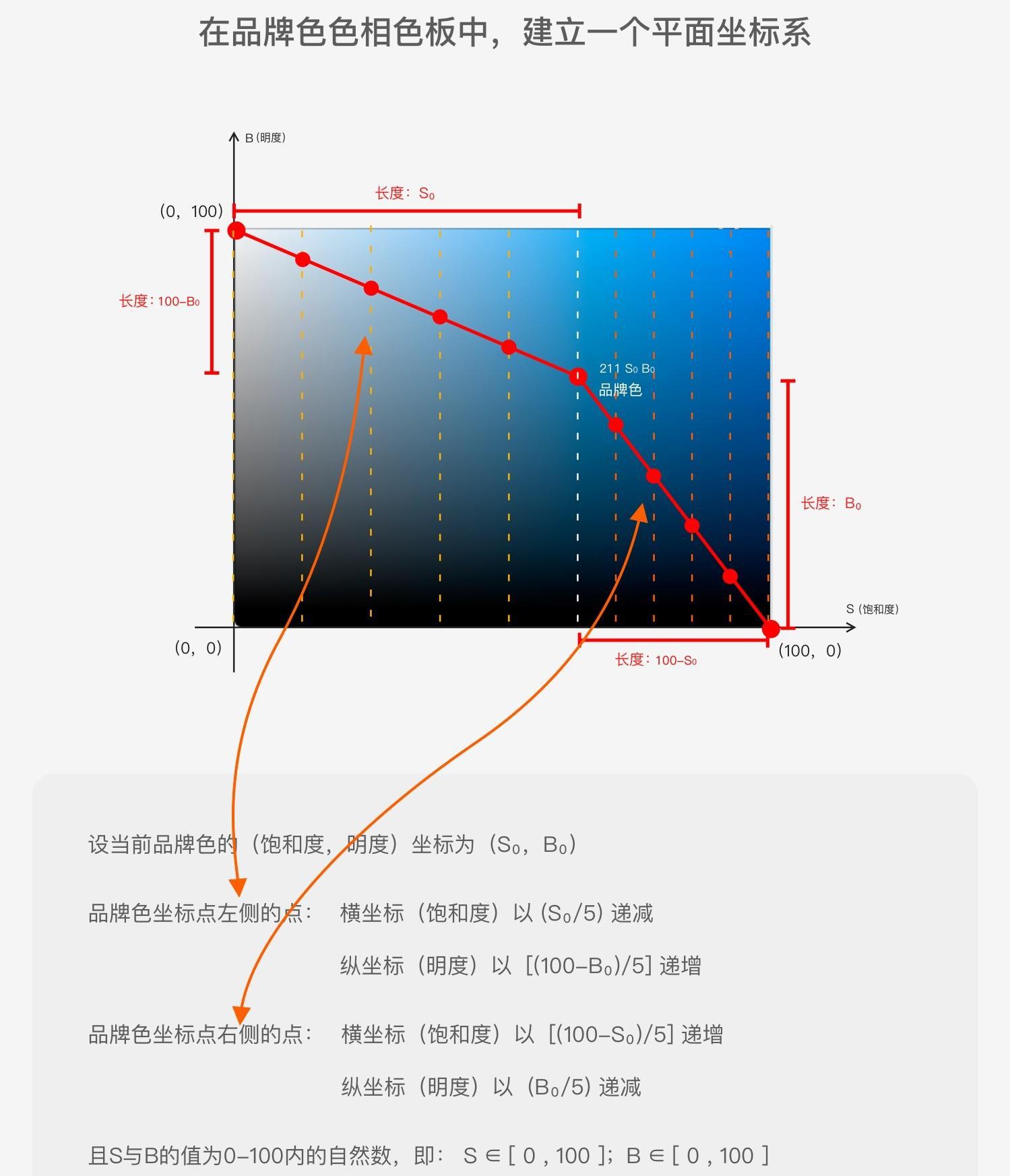 通过拾色板坐标计算同色系色组,以品牌色为基准得出11个同色系色组。