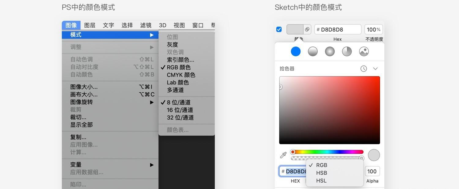 在PS菜单中有多种颜色模式,而UI设计主要需要关注RGB、HSB和HSL这几种颜色模式。