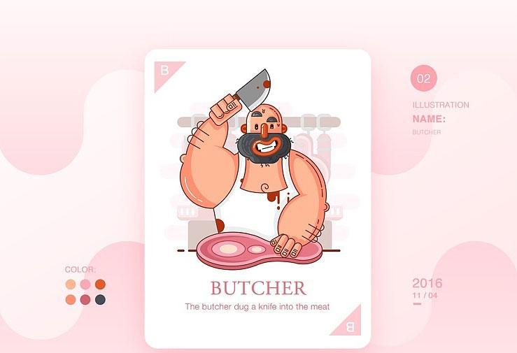 在构思插画时,小魔女007选择了屠夫形象。做任何设计都需要灵感来源,搜索设计站如Pinterest、花瓣、Dribbble获取灵感是个不错的选择。