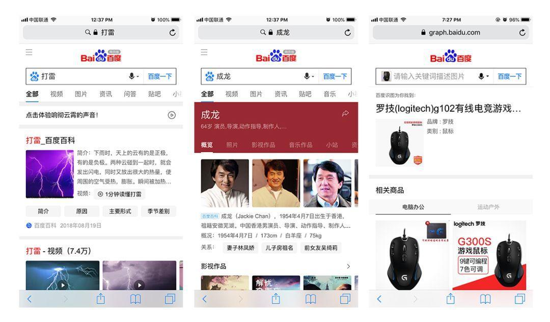 如果你在百度搜索诸如“打雷”或是“成龙”等,就会很形象的出现打雷的声音;成龙的个人简介、兴趣爱好、喜欢的颜色和相关人物推荐等等。又比如你上传一张图片至百度,就会自动统计与该图片相关的信息或图片来源。