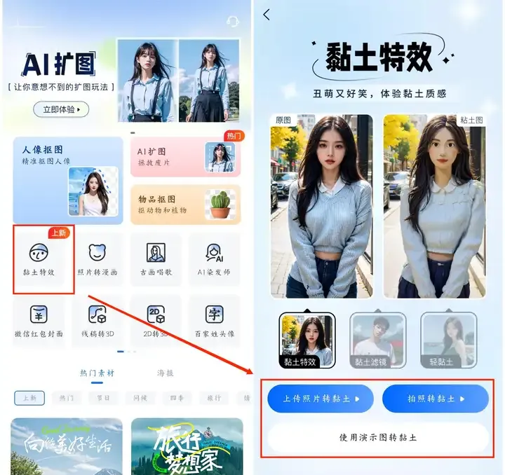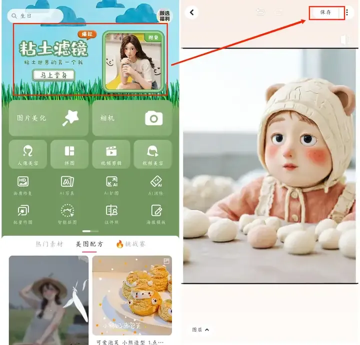 美图秀秀也可以使用粘土滤镜了,打开美图秀秀,点击首页的粘土滤镜,可以限时免费使用,自己搜的美图配方大部分需要会员,进入之后上传图片,再选择一个喜欢的滤镜,稍等片刻就能生成了,最后点击保存即可。