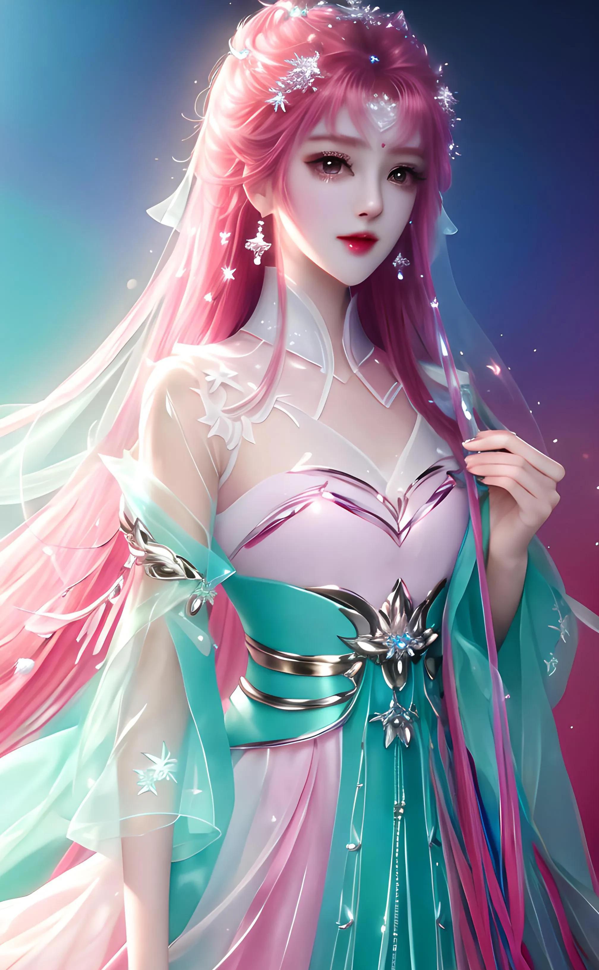 咒语(Prompt): 大师作品,最好画质,更高质量,雪花飘落,高细节,超高分辨率,8k分辨率,景深,脸部微距镜头,短发,水汪汪大眼,上半身镜头,油润光泽的嘴唇,霓虹灯水晶粉色长头发美女 Model: 2.5D国风, CFG scale: 7, LoRA: 明暗线条(0)、明亮质感(1.2)