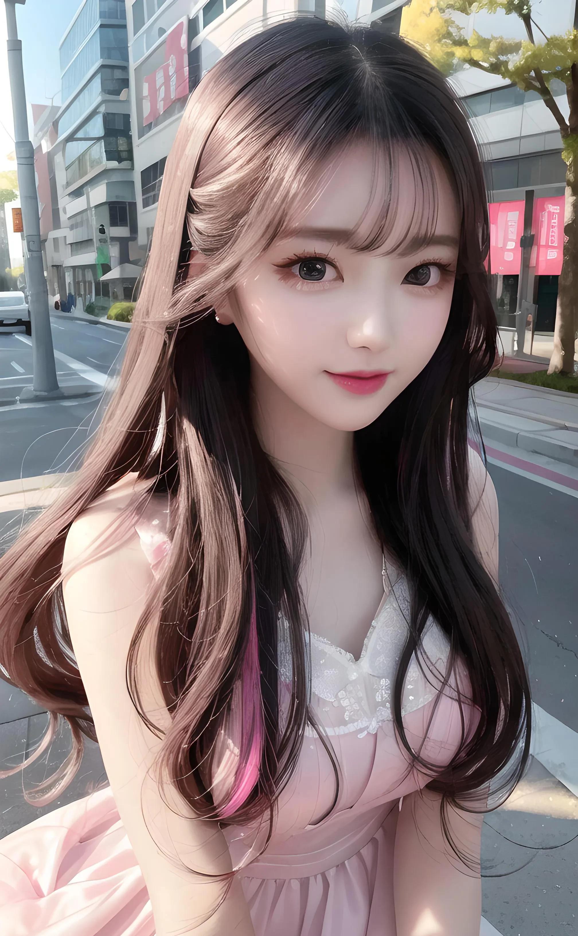 高细节,8k分辨率,超高分辨率,最好画质,美少女,绝世美女,(披散的黑色头发),顺滑的头发,锁骨,美丽的妆容,精致完美的五官,最美的大眼睛,长长的睫毛,眼睛甜美有卧蚕,微笑,口红,在大街上,粉白色精美细致的水光纱连衣裙,,华丽多姿,恬静优美,(靠近观者),动态角度,极致画质,最高精度,丰满,精确完美的人体结构