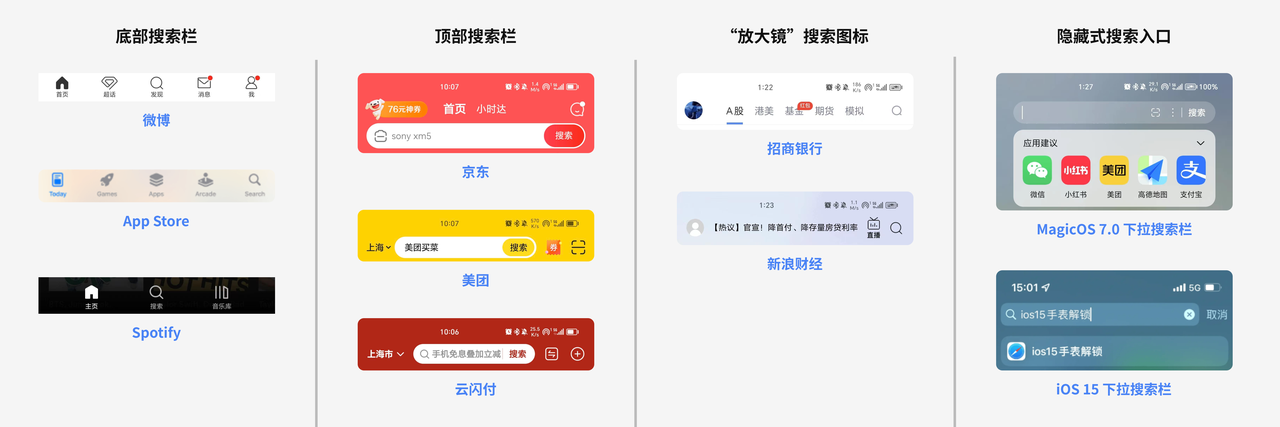 搜索入口是用户与搜索功能直接交互的位置,包括底部Tab栏、顶部搜索栏、放大镜搜索图标和隐藏式搜索入口。不同的设计取决于使用场景和功能权重,搜索入口设计影响用户体验。