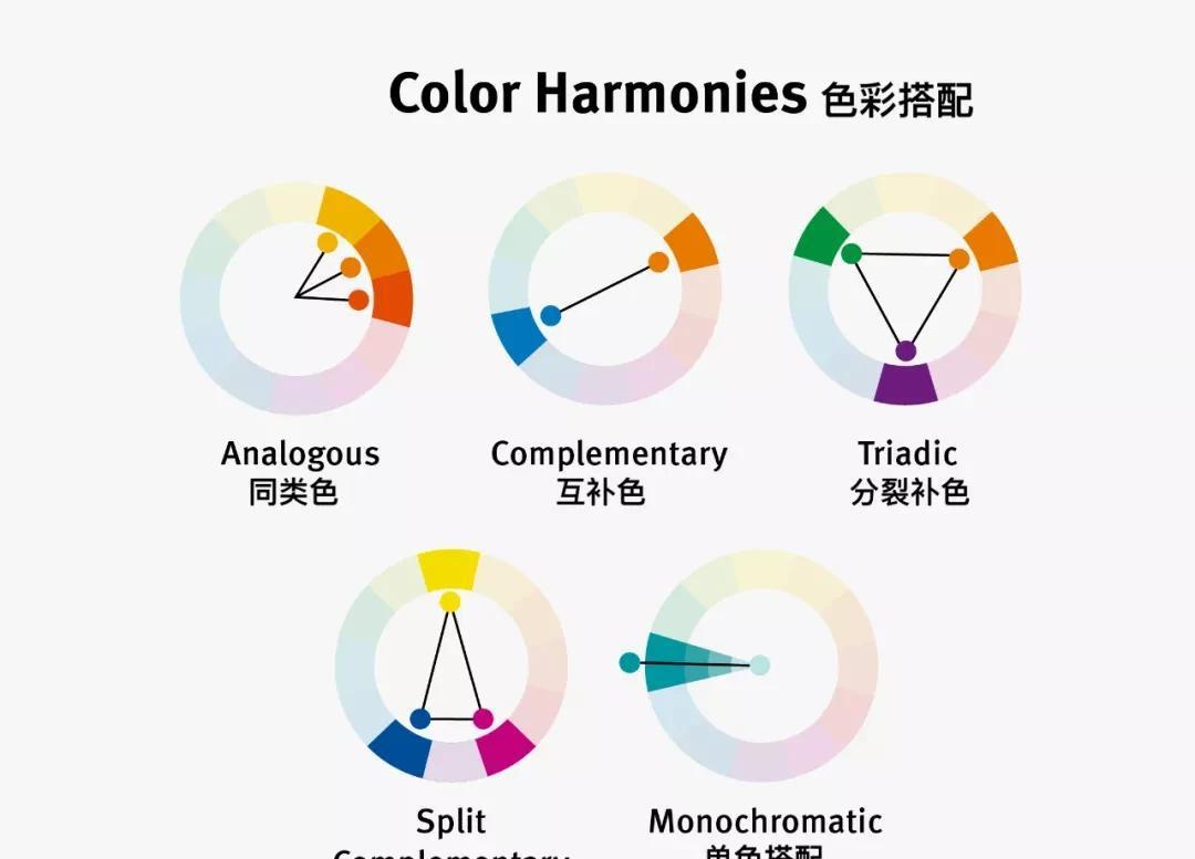色彩搭配最基本且重要的原则是颜色间要相互协调,一些常见的颜色搭配包括: