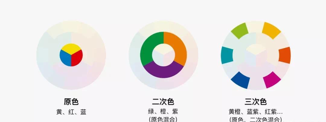 三次色(复色):黄橙、红橙、红紫、蓝紫、黄绿、蓝紫(原色和二次色混合而成)