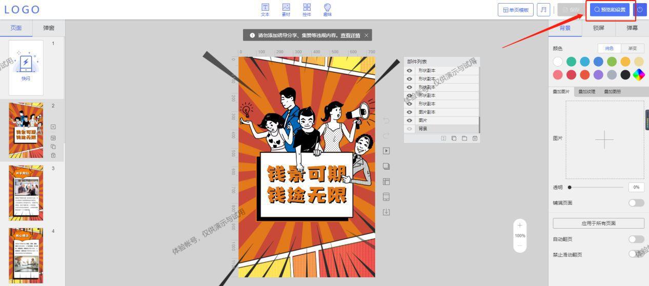 最后,完成招聘H5的制作后,点击【预览和设置】即可保存并查看。之后再点击【分享作品】就可以了。