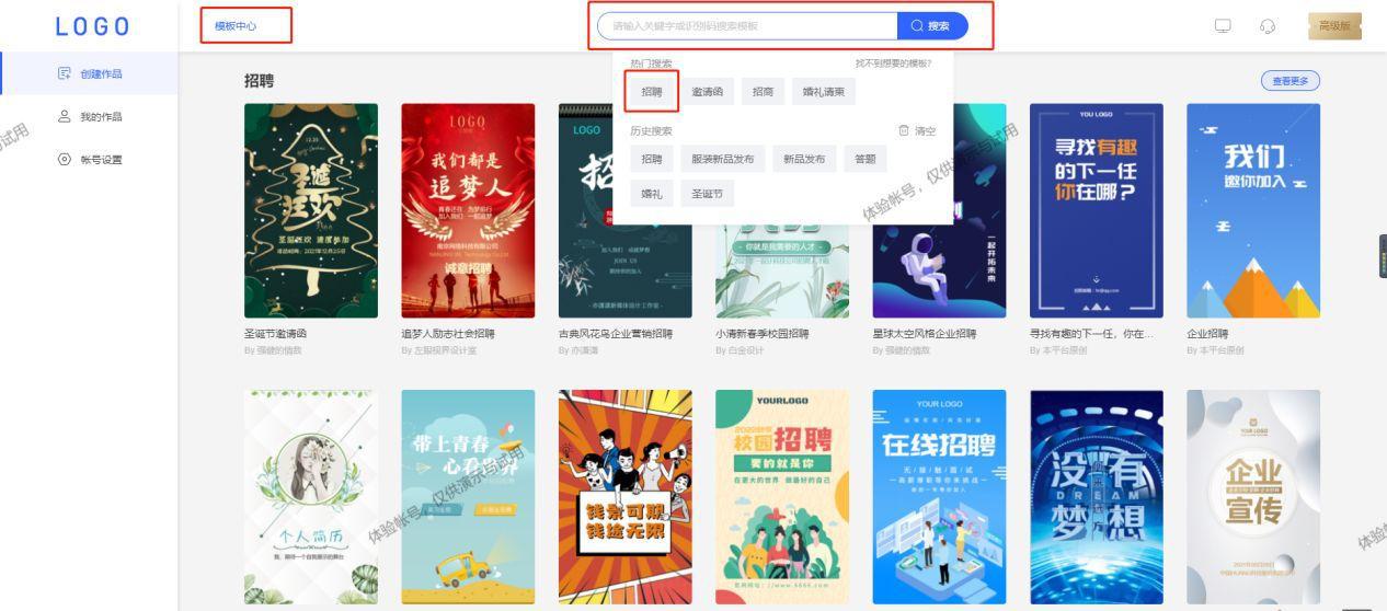 然后,在模板中心页面选择一个自己想要的招聘H5模板,就可以开始设计制作精美酷炫的招聘H5了。这里再给大家提一下,我们可以直接在搜索框内搜索“招聘”即可快速查找并挑选招聘相关的H5模板。