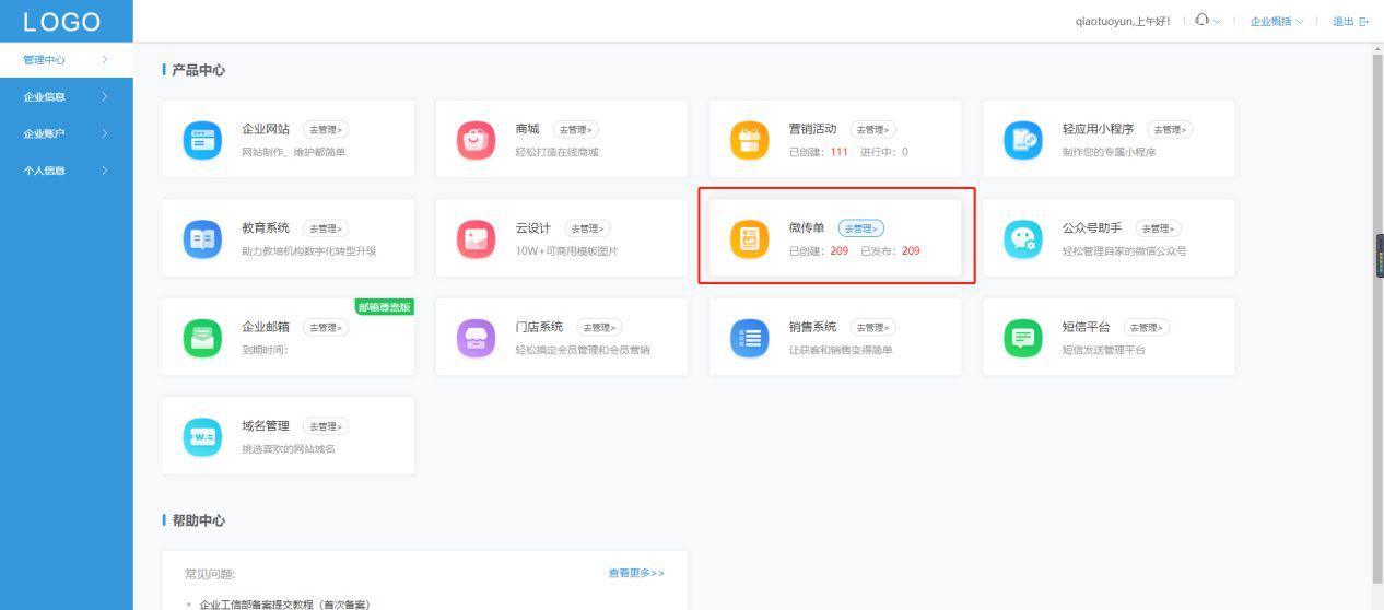 首先,我们自然是要登录乔拓云后台,点击【微传单】进入H5模板中心页面。