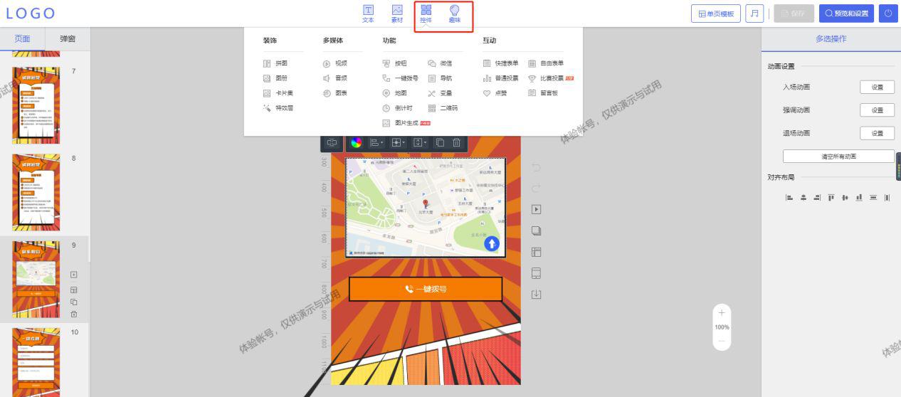 如果你还想要在招聘H5页面中添加二维码、微信、地图、一键拨号等功能,点击【控件】选项即可进行添加。而点击【趣味】选项,我们则可添加画中画、快闪、走马灯、微信对话、微信群聊、手机来电等功能。