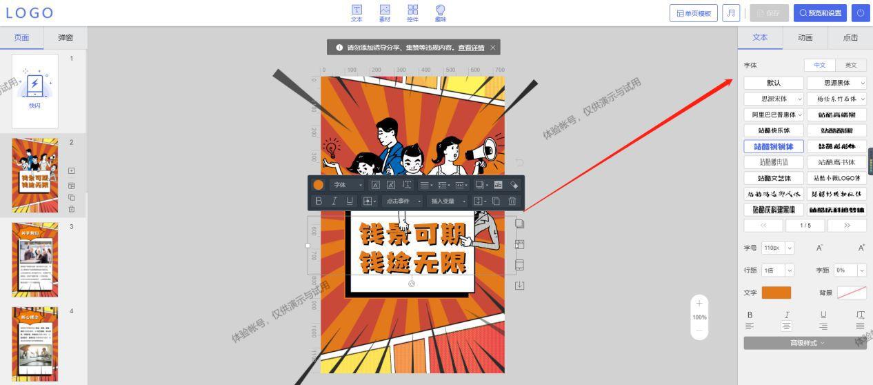 选好模板之后,就可对其进行设计修改与完善企业和招聘职位信息了。直接点击H5模板中要修改的内容即可进行编辑与修改,H5页面中的文字、图片、背景、功能等都可以点击直接修改。