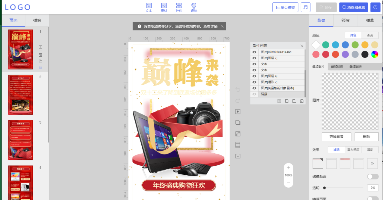 在H5微场景设计页面中,主题图片、音乐、文字等,都可以进行修改再次编辑,还可以添加各种黑科技技术,与用户进行更好的互动。
