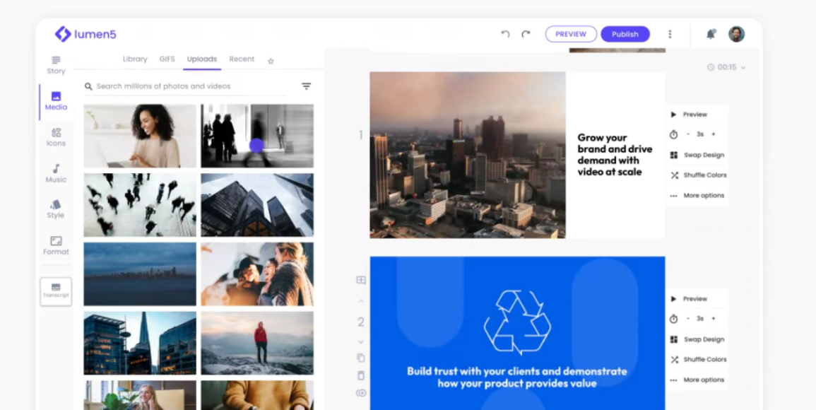 1. Lumen5:Lumen5是一个基于AI的视频制作工具,可以将文本转换为视频。无论是使用现有的文章还是从头开始编写,Lumen5都能满足您的需求。该工具提供720p分辨率的视频,让您的作品更加清晰流畅。