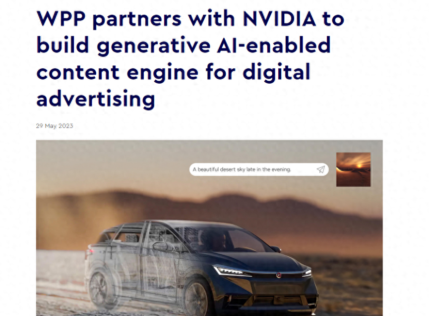 5月30日,全球最大广告公司WPP宣布与NVIDIA达成技术合作,将共同开发生成式内容引擎,助力创意团队加速商业广告制作效率。新内容引擎支持自然语言文本提示生成图片、3D模型、视频等,引领广告制作新潮流。据悉,NVIDIA Omniverse、NVIDIA Picasso等多款产品融合打造的内容引擎将掀起全球服务热潮。