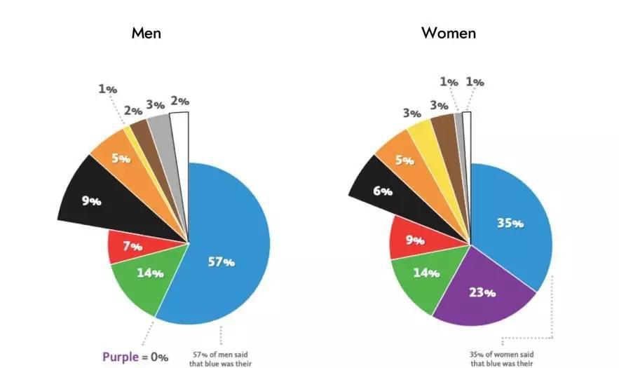下图是根据JoeHallock的研究,不同性别的色彩选择,从最喜欢的色彩到不那么喜欢的色彩分别所占的比例。