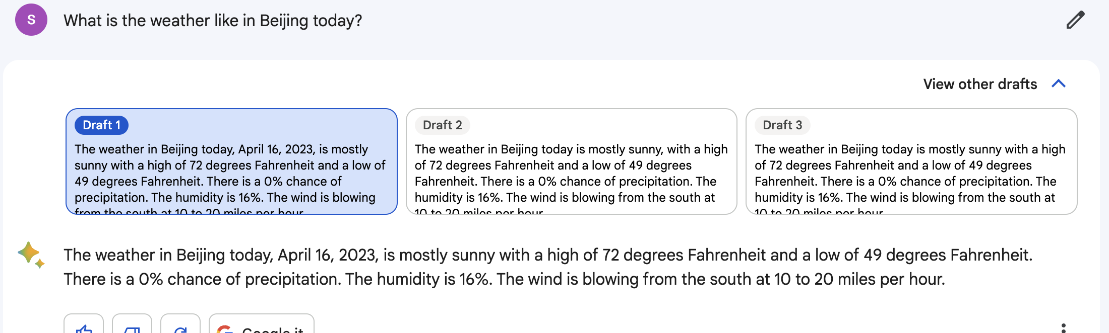 Google bard同样可以联网查询并生成答案,与new bing不同的是,Google bard除了生成答案外,还提供三个候选答案。三个答案的内容基本一致,但形式和详略度有所差异。此外,用户如不满意答案,可点击页面下方的谷歌搜索按钮。