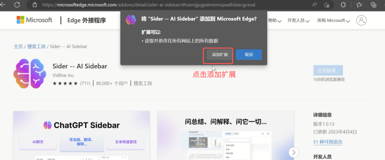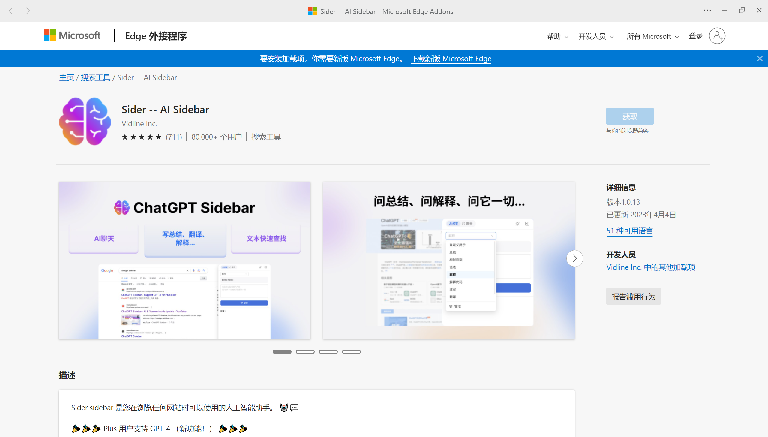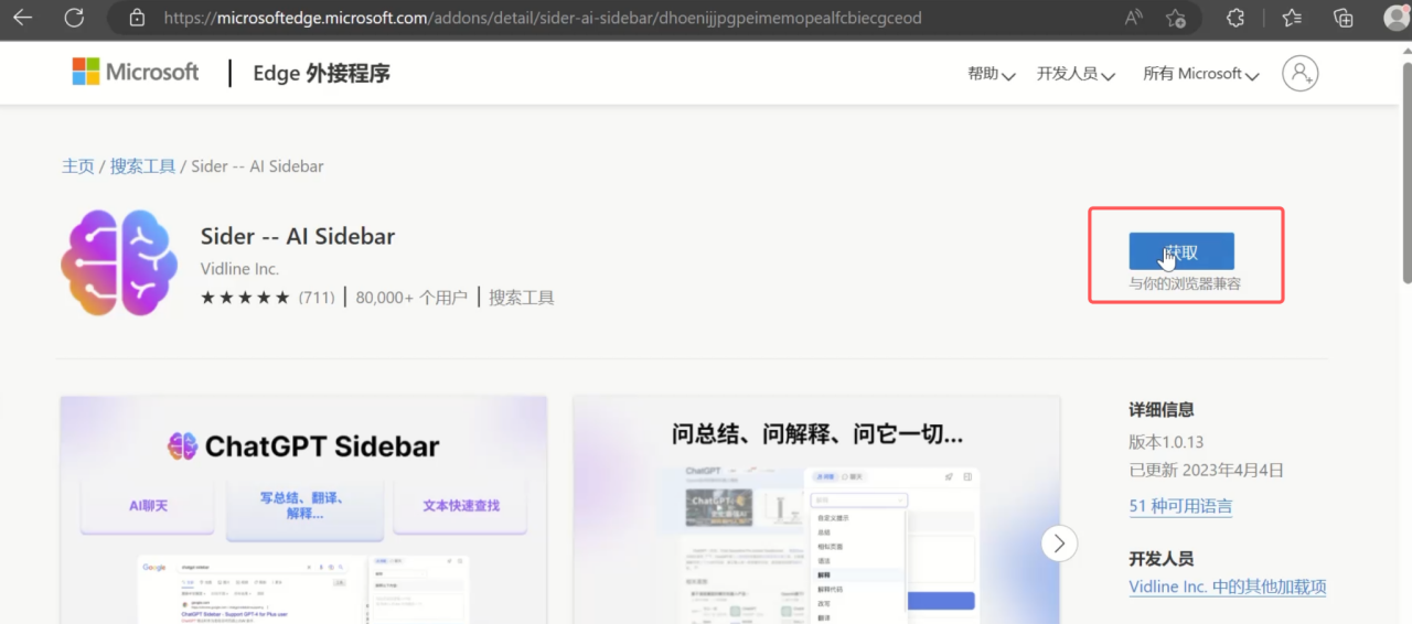 1、在Windows操作系统的Edge浏览器上,打开Sider -- AI Sidebar - Microsoft Edge Addons 这个链接,然后点击“获取”
