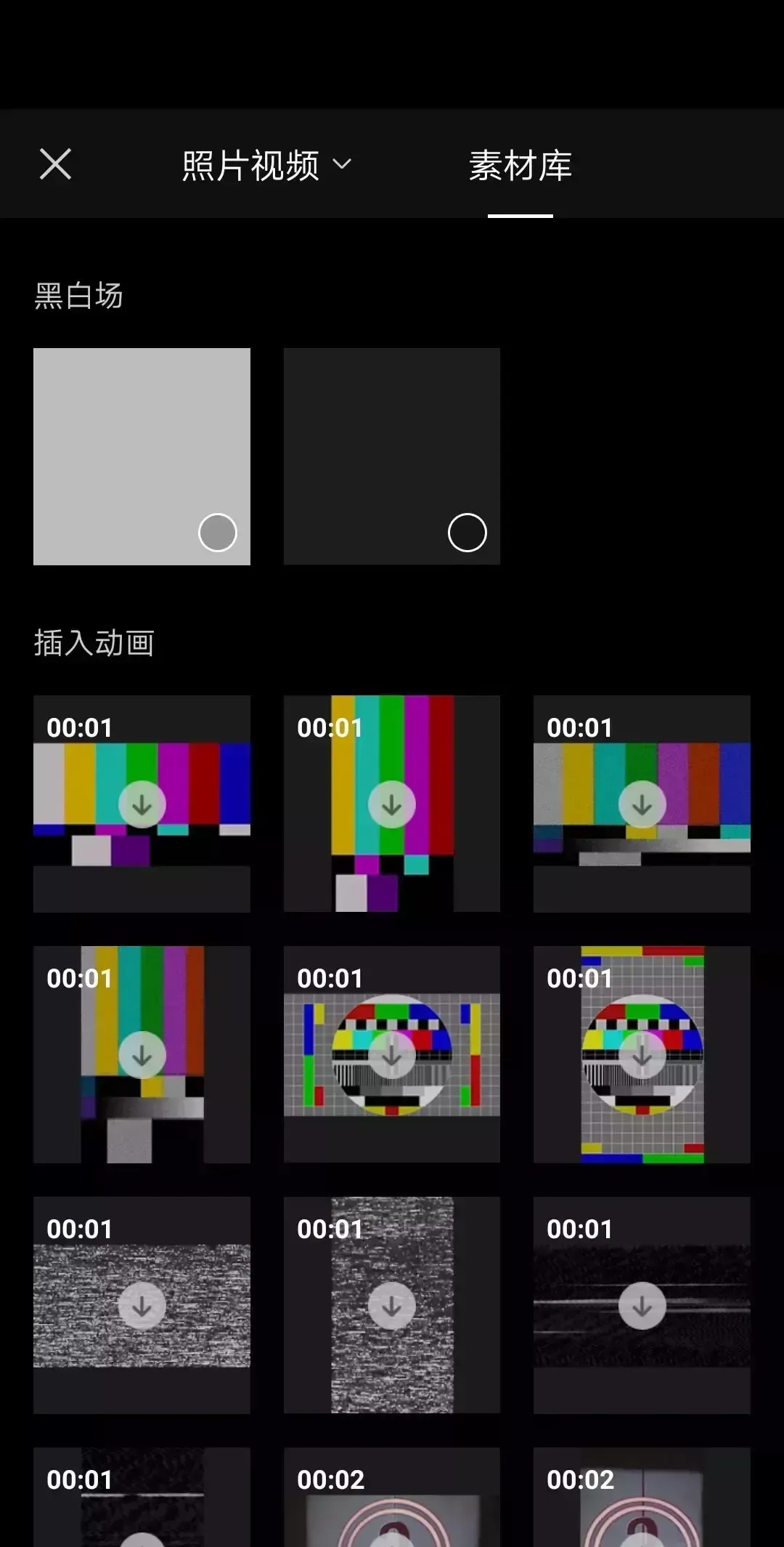 点击新建项目即可选择素材开始创作。除了相册视频外,剪映还提供黑白场景及动画素材。
