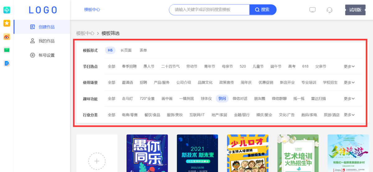 在乔拓云这样的第三方平台里就能找到各种H5模板。模板中有各种趣味功能,如快闪、一镜到底、画中画等,根据个人喜好选择。点击预览各种功能,轻松找到适合的H5模板,根据节日、场景、行业分类等进行挑选。