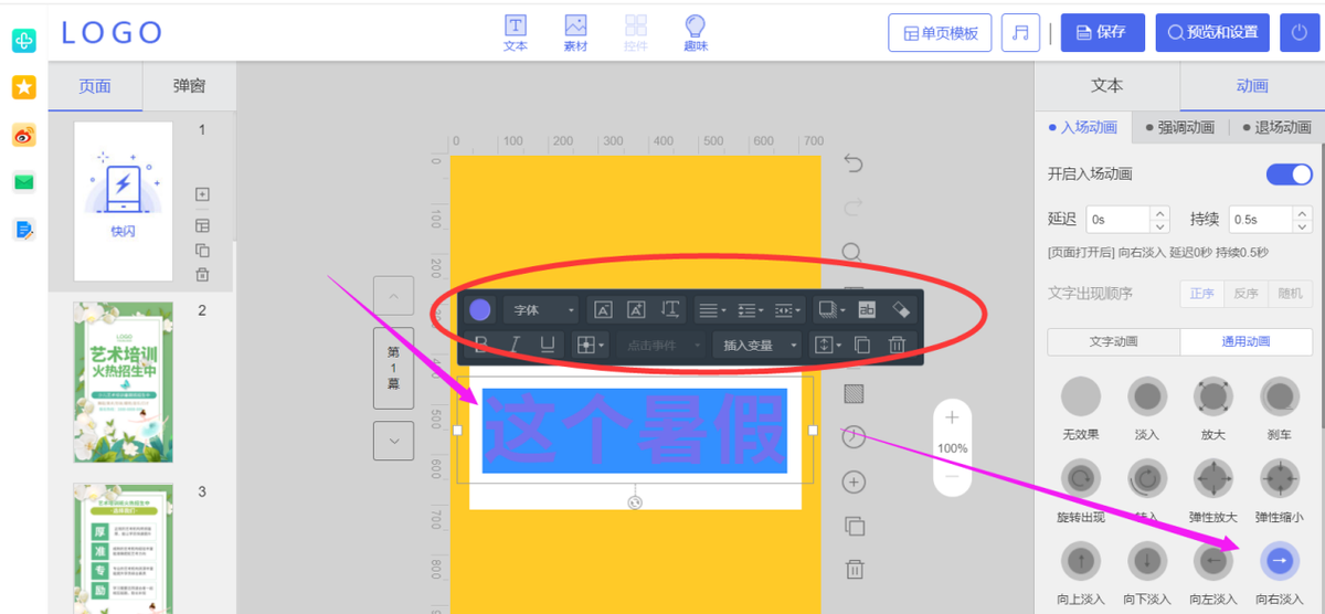 打开快闪模板后,直接使用模板进入编辑页面。文本、图片都可以轻松更换内容,元素的动画效果也可在编辑面板随意调整。